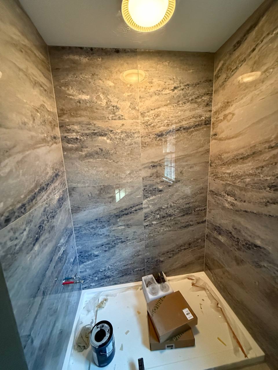 Install new tile, grout, cleaning