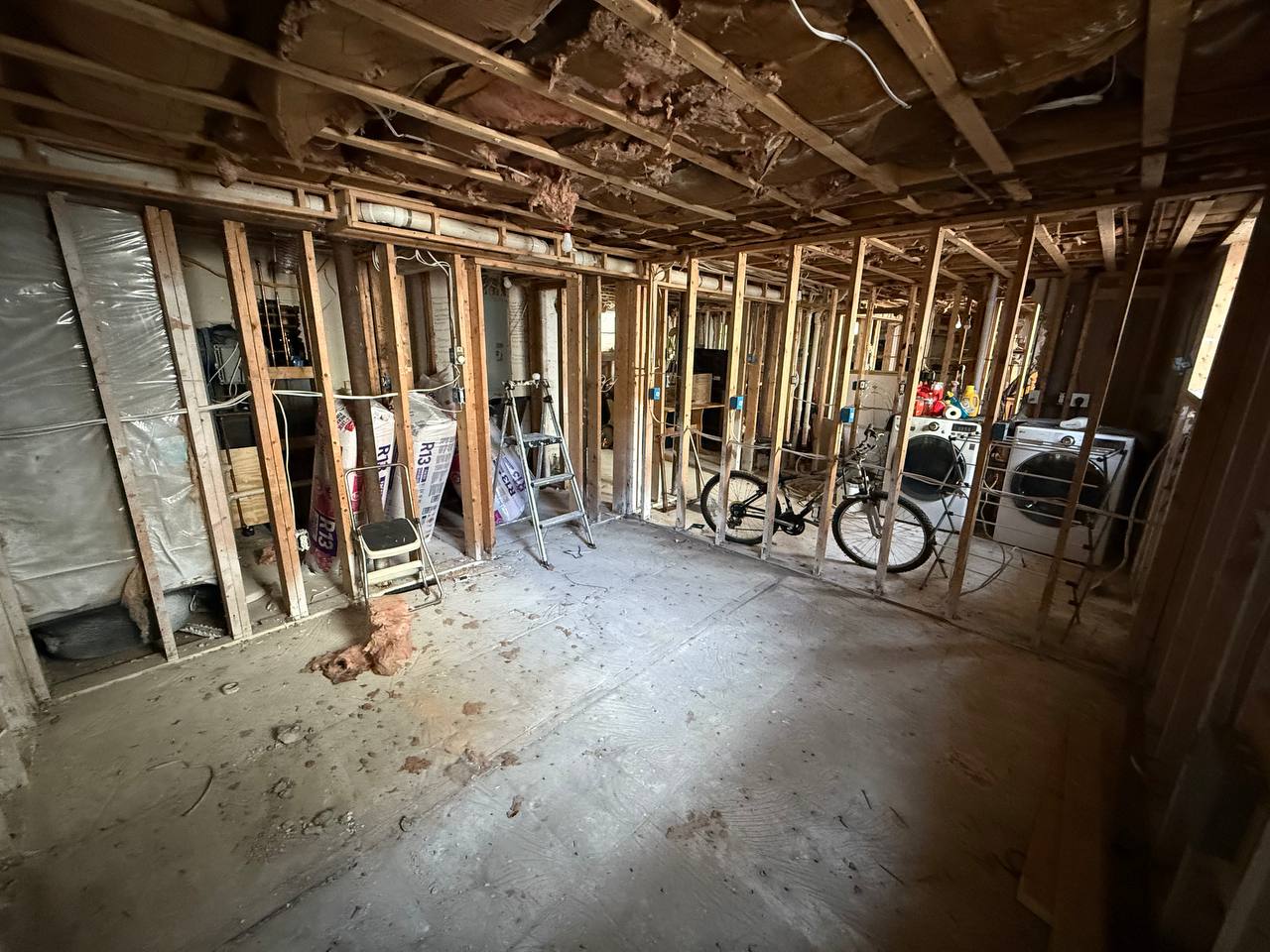 Removal of old floor, remove old walls, install new floor, install new walls, new ceiling, tiling, painting