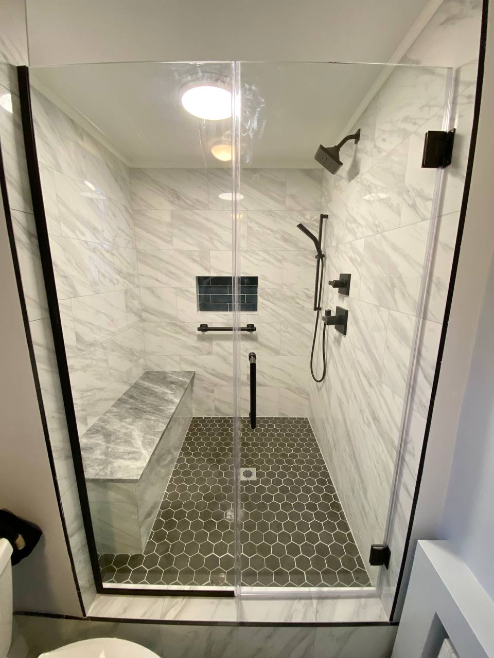 Removing old shower, new walls, Tiling, new floor, new lights, new bench